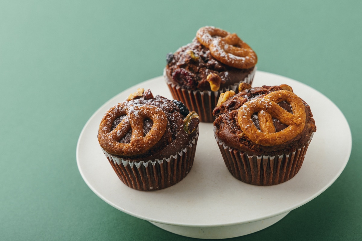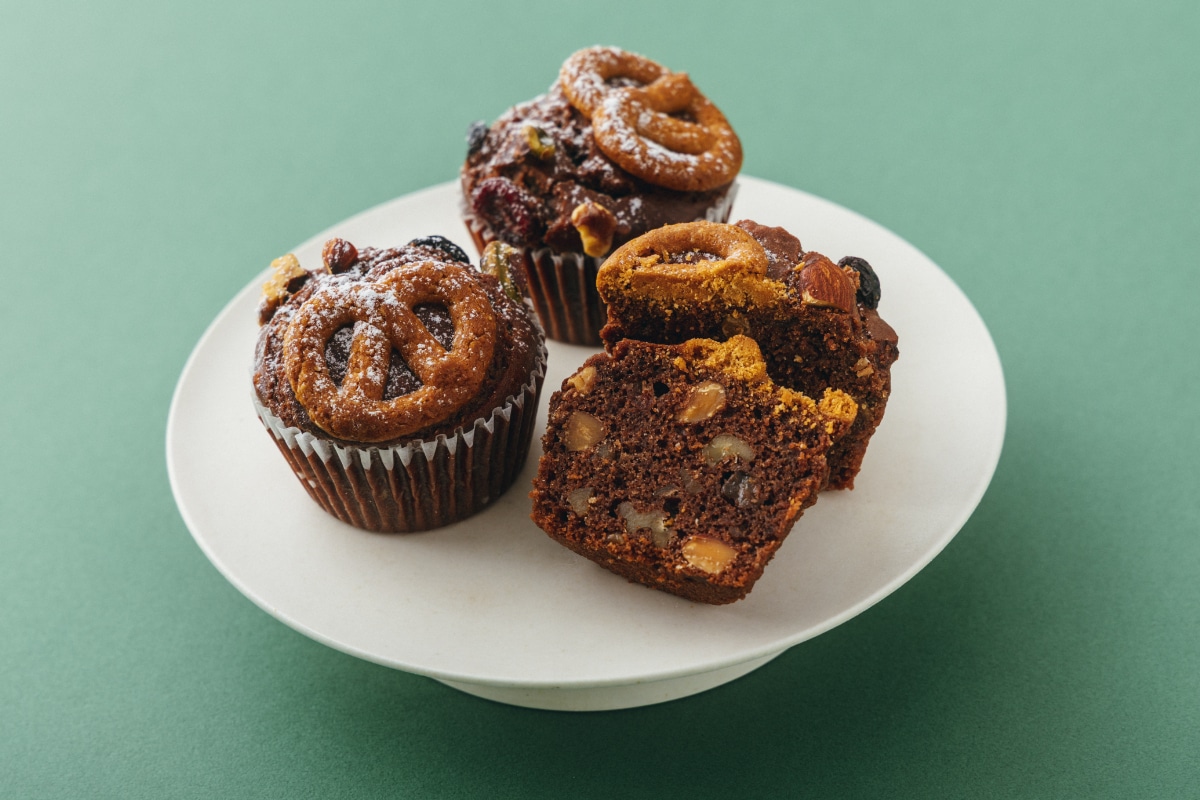 ココアをたっぷりと加えたマフィン生地に、ラムフルーツやナッツをたっぷり加えました。
